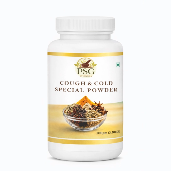 PSG Ayurvedic Cough & Cold Special Powder is a herbal formulation designed to help relieve cough, cold, throat irritation, and congestion. It supports respiratory comfort and immunity using traditional Ayurvedic ingredients.